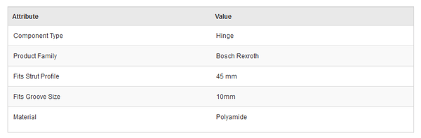 Bosch Rexroth Polyamide Door Hinge, 10mm Slot - 3842544505 - NewCondition: Brand new, still in OEM packaging.Product Features: Material: Polyamide with Aluminium and Steel Pin Slot Size: 10mm Use: Ideal for small doors or flaps, offering precise positioning with centering...View more