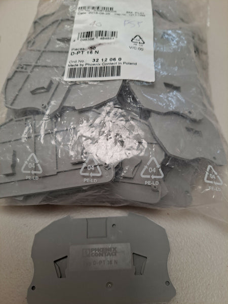 Phoenix Contact 3212060  End cover - D-PT 16 N - Pack of 10 - Brand new item, still in OEM packaging  - Check out the images for more product details Product Details: End cover, length: 75.4 mm, width: 2.2 mm,...View more