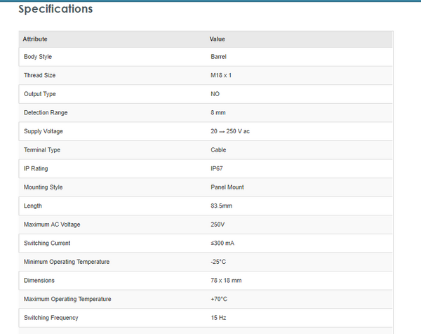 RS Pro CR18SCN08ATO Capacitive sensor 8 mm length 83.5mm NO supply voltage 20 → 250 V ac IP67 - Brand new item, still in OEM packaging  - Check out the images for more product details Product details RS branded plastic...View more