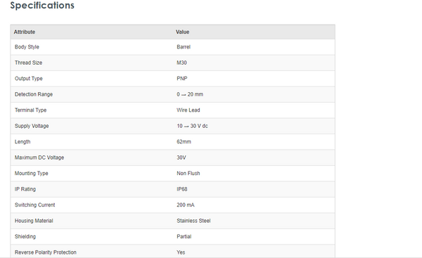 RS Pro NI20U-EM30-AP6X M30, PNP Inductive Sensor 62mm Length, 10 → 30 V dc supply voltage , IP68 Rating - Brand new item, still in OEM packaging  - Check out the images for more product details Product details RS Pro...View more