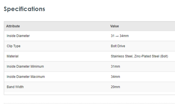 RS Pro SC31-34SUF Stainless Steel, Zinc-Plated Steel (Bolt), 20mm Band Width, 31mm - 34mm Inside Diameter - Brand new item, still in OEM packaging  - Check out the images for more product details Product details Wide Band Bolt Clip Band...View more