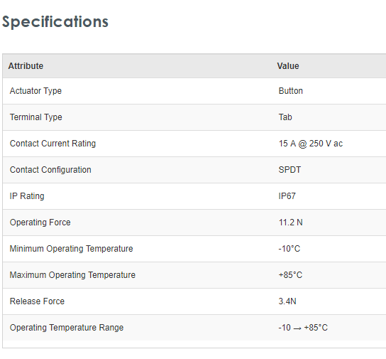 Saia-Burgess VCF9T3BQR-UL SPDT Button Microswitch, 15 A @ 250 V ac - Brand new item, still in OEM packaging  - Check out the images for more product details Product details Available fitted with various actuators Plain shrouded button versions (as...View more