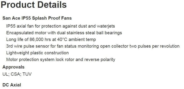 Sanyo Denki Splash Proof Fan - IP55 - 24V DC - Brand New in Box Description: This brand-new Sanyo Denki Splash Proof Fan is an excellent choice for applications requiring a reliable, splash-proof cooling solution. The fan is designed to...View more