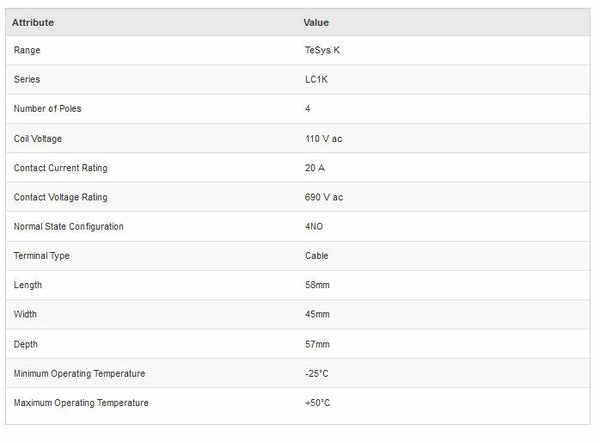 Schneider Electric LC1K09004FC7 Pole Contactor 4NO 20A 110Vac Coil - New - Brand new item, still in OEM packaging  - Check out the images for more product details Product details: Attribute                   Value Range   :  TeSys K Series   : ...View more