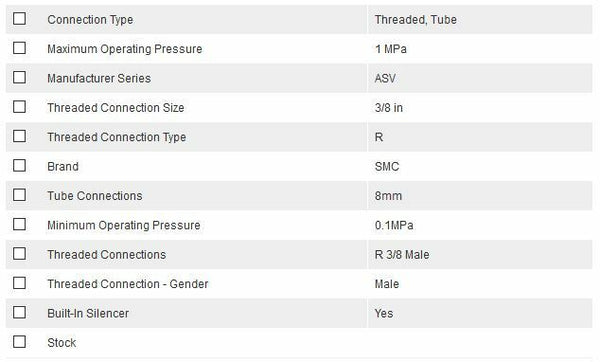 SMC ASV410F-03-08S Speed Exhaust Controller, 3/8 in R 3/8 Male x8mm - New - Brand new item, still in OEM packaging  - Check out the images for more product details Product details:- SMC Adjustable Quick Exhaust ValveSilencers and Exhaust Restrictors...View more