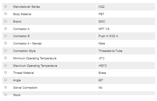 SMC KQ2L03-34AS Threaded-to-Tube Elbow Connector NPT 1/8 to Push In 5/32 in, KQ2 Series - New - Brand new item, still in OEM packaging  - Check out the images for more product details Product details:- Male Elbow KQ2L The KQ2L...View more