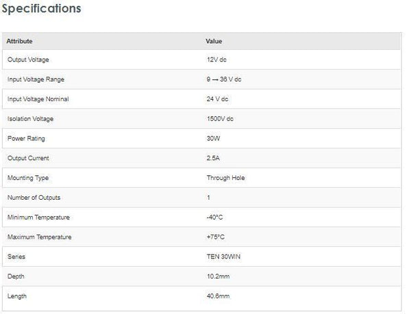 TRACOPOWER TEN 30-2412WIN 30W Isolated DC-DC Converter Through Hole, Vin 9 → 36 V dc, Vout 12V dc-New - Brand new item, still in OEM packaging  - Check out the images for more product details Product details: Traco 30W Single/Dual/Triple Output...View more
