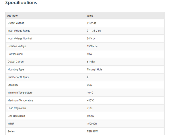 TRACOPOWER TEN40-2422WI TEN 40WI 40W Isolated DC-DC Converter Through Hole, Vin 9 → 36 V dc, Vout ±12V dc - Brand new item, still in OEM packaging  - Check out the images for more product details Product details 40W single/dual...View more