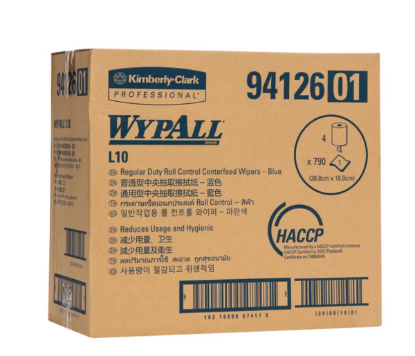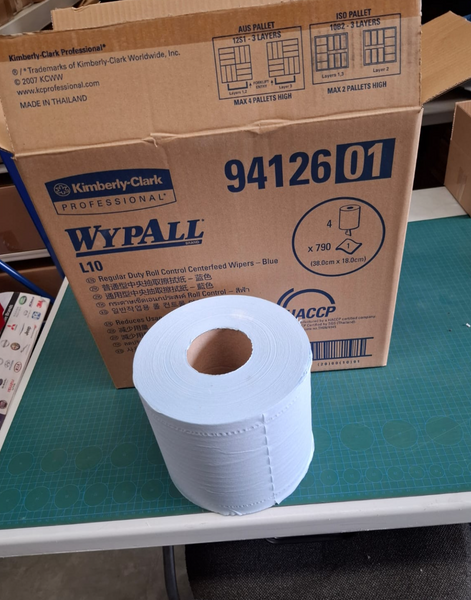 WYPALL L10 Roll Control Centrefeed Wiper (94126) Dry Light Cleaning Towel, Centrefeed of 3160 wipers per pack. Key Features WYPALL L10 Centrefeed Wiper Blue Single Use 4 Rolls x 300M (94126) | Kimberly Clark Professional Colour: Blue Size: 18cm x 38cm/wiper...View more