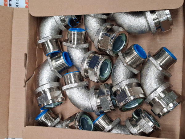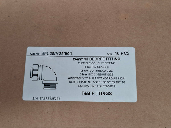 ABB M-Type 90-Degree Swivel Elbow Fitting M25, SPL25/M25/90 90-degree elbow fitting with fixed external male thread.  For insertion into threaded entries or knockouts to connect conduit.  Typical applications include industry processing and automation.  Temperature range of -65 to +150 degrees...View more