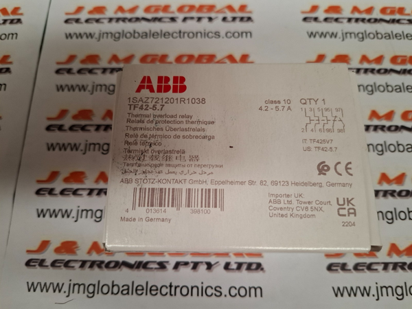 Contactor Overload Thermal Overload 4.2 - 5.7 A - ABB - TF42-5.7 Manufacturer: ABB Part Number: TF42-5.7 The TF42-5.7 thermal overload relay is an economic electromechanical protection device for the main circuit.  It offers reliable and fast protection for motors...View more