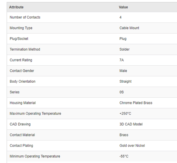 Lemo FFA.0S.304.CLAC44 0S Series, 4 Pole Cable Mount Connector Plug, with Male Contacts - Brand new item, still in OEM packaging  - Check out the images for more product details Product details From Lemo, this S series of Multipole Circular...View more