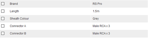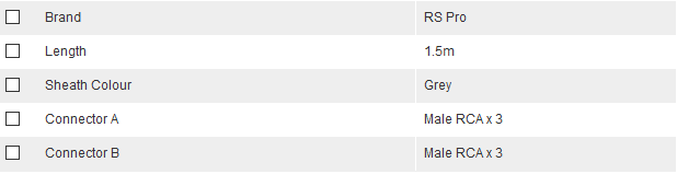RS Pro 410-921 1.5m RCA Cable Male RCA x 3 to Male RCA x 3 Grey - New - Brand new item, still in OEM packaging  - Check out the images for more product details Product details:- 3 x RCA...View more