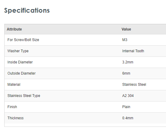 RS Pro A2WASHERMINT03RS Plain Stainless Steel Internal Tooth Shakeproof Washer, M3, A2 304 (1 bag of 100) - Brand new item, still in OEM packaging  - Check out the images for more product details Product details A2 Stainless Steel -...View more
