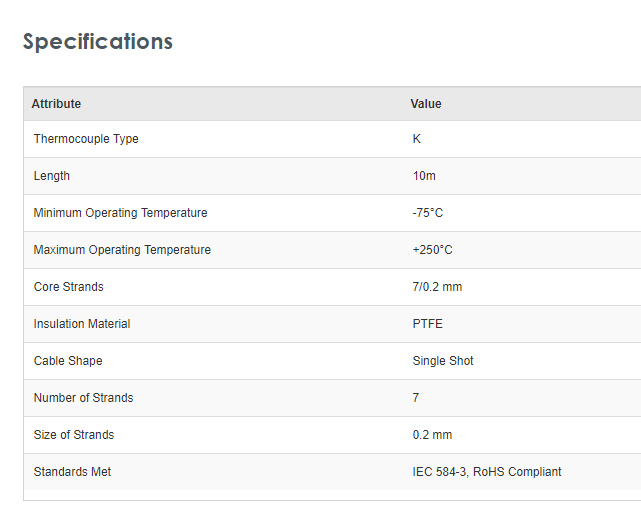 RS Pro XQ-1035 Thermocouple & Extension Wire Type K, -75 → +250 °C PTFE Sheath 10m - Brand new item, still in OEM packaging  - Check out the images for more product details Product details Thermocouple type K 10 metre...View more