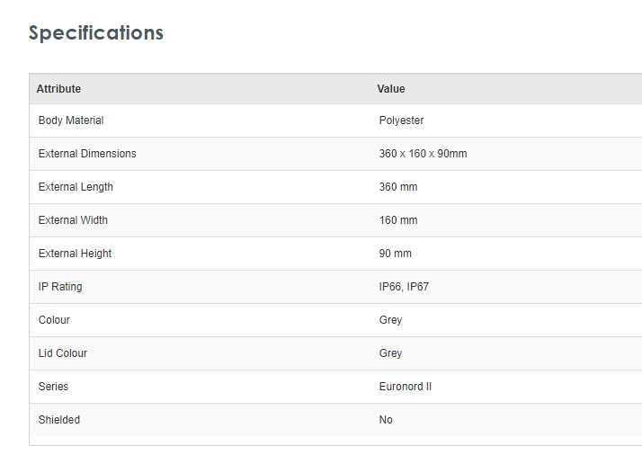 Fibox P-163609 Euronord II Polyester Enclosure, IP66, IP67, 360 x 160 x 90mm - Brand new item, still in OEM packaging  - Check out the images for more product details Product details Temperature range –40°C to +80°C Stainless steel screws...View more