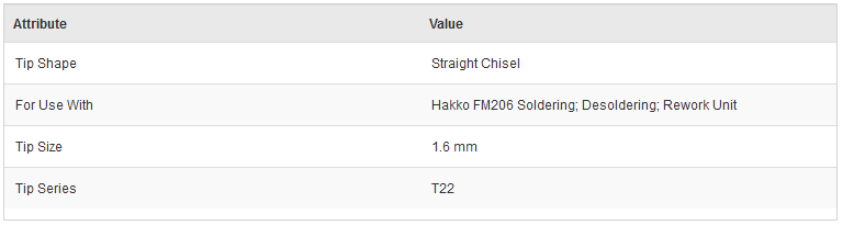 Hakko T22-D16 1.6mm Straight Chisel Soldering Iron Tip - New - Brand new item, still in OEM packaging  - Check out the images for more product details Product details:- T22 Series Replacement TipsThese T22 Series Soldering Tips from Hakko are...View more