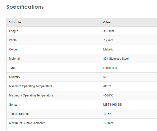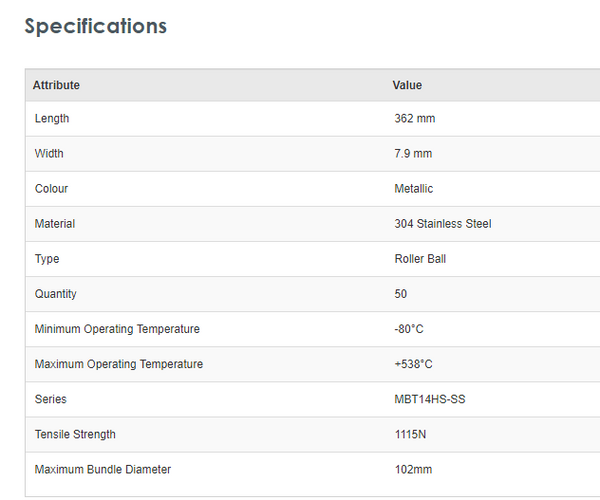 HellermannTyton 11194148 Metallic 304 Stainless Steel Roller Ball Cable Tie, 362mm x 7.9 mm, MBT14HS-SS Series (1 Bag of 50) - Brand new item, still in OEM packaging  - Check out the images for more product details Product details The...View more