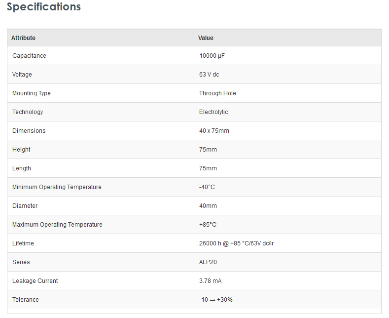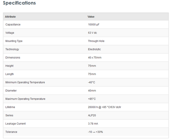 KEMET ALP20A103DE063 10000μF 63V dc Aluminium Electrolytic Capacitor, Through Hole 40 x 75mm +85°C 40mm 75mm - New - Brand new item, still in OEM packaging  - Check out the images for more product details Product details:- ALP20 SeriesPCB mounting...View more