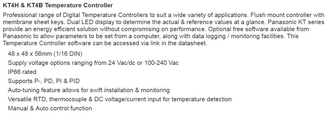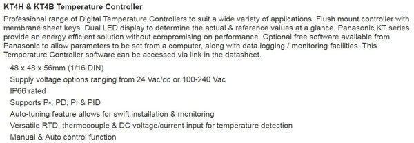 Panasonic KT4B PID Temperature Controller - New in Box -Brand New, unused, still in OEM packaging -Check out the images for more product details Product details Manufacturer: Panasonic Manufacturer Part Number: AKT4B211100 Product Shipping Size: 160 x 70 x 70mm...View more