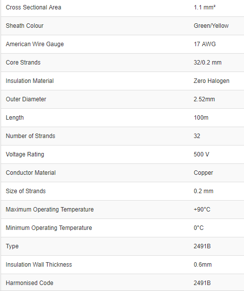 RS Pro 6A-2491B1-GW Green/Yellow, 100m Zero Halogen Equipment Wire, 1.1 mm² CSA, 500 V 17 AWG (1 Reel of 100 Metre) - Brand new item, still in OEM packaging  - Check out the images for more product details Product details...View more