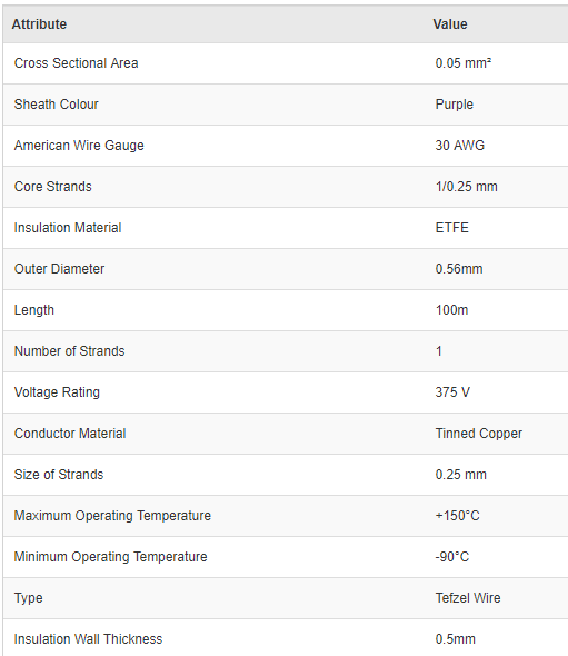 RS Pro Purple, 100m ETFE Equipment Wire, 0.05 mm² CSA , 375 V 30 AWG - 100-30TV