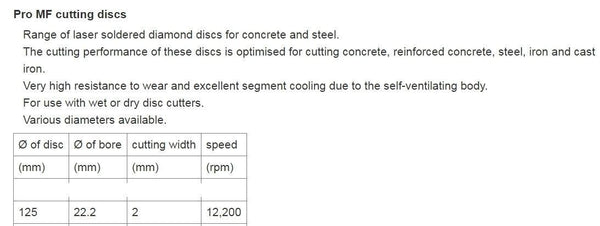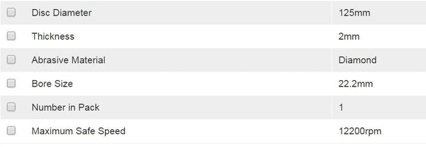 Sidamo Diamond Ultra Thin Cutting Disc 12200 rpm 125mm- New in Box -Brand New, unused, still in OEM packaging -Check out the images for more product details Product details Manufacturer: Sidamo Manufacturer Part Number: 11101099 Product Shipping Size: 190 x...View more