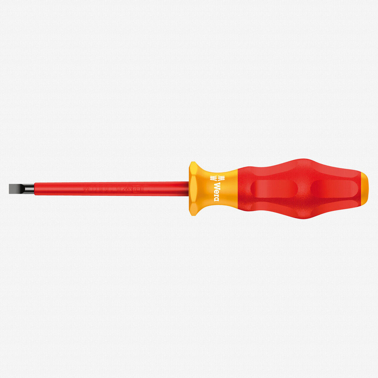 Wera 05031582001  1160 i VDE Kraftform Comfort Insulated 1000V Slotted ScrewdriverTip width: 3.5mm (9/64")Tip thickness: 0.6mmBlade length: 100mm (4")Overall length: 181mm Insulation is individually tested at 10,000 - rated at 1,000 V in accordance with DIN EN 60900 (IEC 60900:2004) Multi-component Kraftform...View more