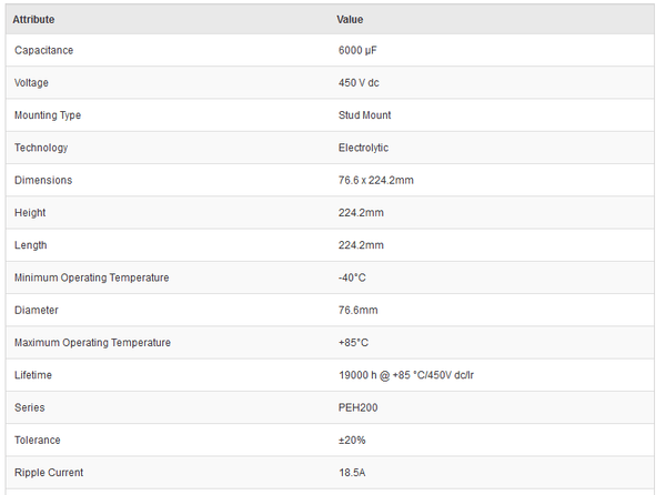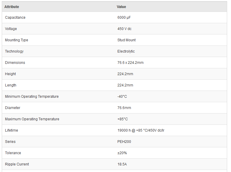 Kemet PEH200YX460BQB2 6000μF 450V dc Aluminium Electrolytic Capacitor, Stud Mount 76.6 x 224.2mm +85°C 76.6mm 224.2mm - New - Brand new item, still in OEM packaging  - Check out the images for more product details Product details:- PEH200 SeriesThreaded stud...View more