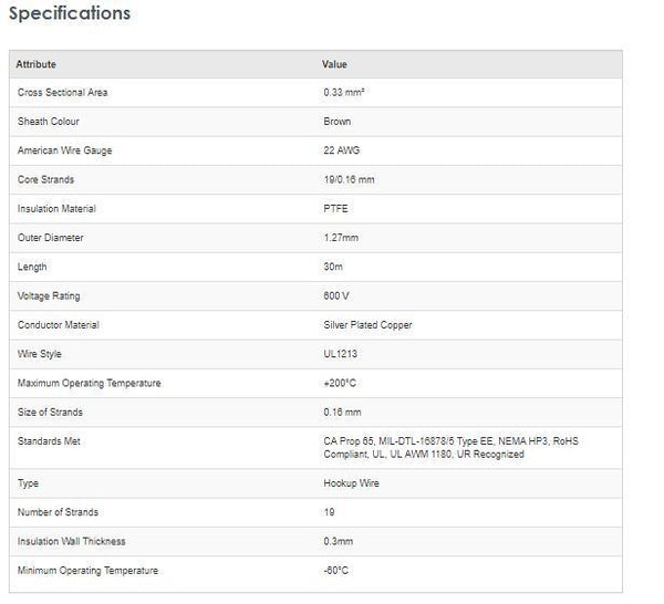 Alpha Wire Brown PTFE Equipment Wire UL1213 MIL-DTL-1678/5 Type EE Standards, 0.33 mm² CSA , 600 V 22 AWG, 30 metre reel. Product details: Alpha Wire PTFE Hook-Up Wire Hook up wire is a single insulated conductor wire that can...View more