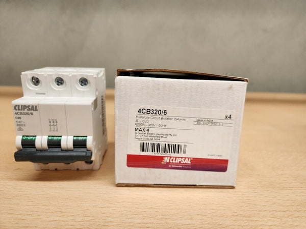 CLIPSAL 4CB320/6  20AMP THREE POLE 6KA CIRCUIT BREAKER C CURVE   -Brand new item, still in OEM packaging  -Check out the images for more product details   Product details MCB 6KA 20A 3 POLE 240V AC C-CURVE 3 MODULE DIN...View more