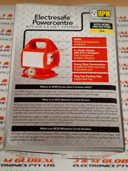 ELECTRESAFE POWER CENTRE WITH USB A+C AND RCBO PROTECTION NHP- REPC410USBACPRODUCT DETAILS: Powerboard - Worksite portable powercentre 10A 2400W 4 outlets IP33 orange RCBO protect. 1.8m lead 2 x 2.4A USB Type A and C Residual Current/Earth leakage circuit breaker...View more