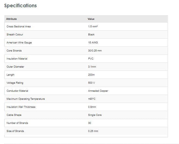 Taiyo Cabletec - C3/RV-90 1.5 SQ.MM -   Black Equipment Wire, 1.5 mm² CSA , 500 V 15 AWG, 200m-New - Brand new item, still in OEM packaging  - Check out the images for more product details Product details: Conductor area 1.5mm Overall...View more