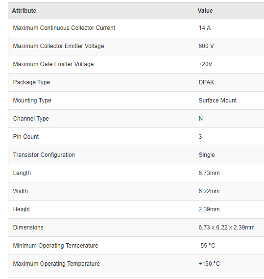 Infineon IRG4RC10SPBF IGBT, 14 A 600 V, 3-Pin DPAK (In a Pack of 5)     - Brand new item, still in OEM packaging  - Check out the images for more product details   Product details   Optimised IGBTs designed for...View more