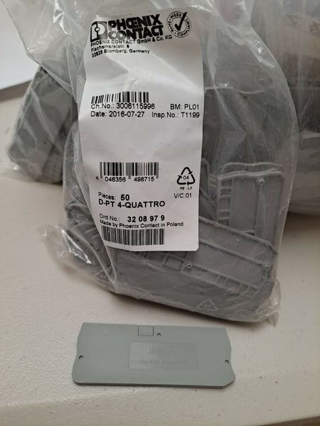 Phoenix Contact 3208979 D-PT 4-QUATTRO Cover for Terminal Block - Pack of 50 - Brand new item, still in OEM packaging  - Check out the images for more product details Product Details:PT 4 DIO Component Terminal Blocks Compact designCan be...View more