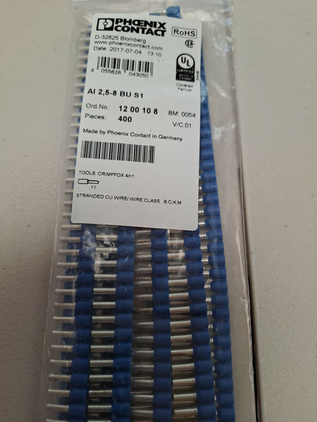 Phoenix Contact 1200108 Ferrule - AI 2.5-8 BU S1 - Pack of 100 - Brand new item, still in OEM packaging  - Check out the images for more product details Product Details: Taped ferrules, 2.5 mm², sleeve length 8 mm, with plastic...View more