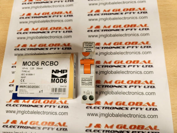 RCBO 1P-D 6KA 30MA 25A MOD-C - NHP - MD6M6RCBD2530CPRODUCT DETAILS: RCBO MOD6 1P+N 6kA C CURVE 30mA TYPE A- Complies with AS/NZS 61009 (RCBOs)- MOD6 RCBOs feature 6kA short circuit rating- Compact double screw RCBO- Type A RCD with...View more