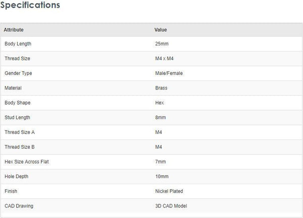 Richco SR2701  Brass Hex Threaded Standoff Male/Female, 25mm, M4 x M4 - New, best quality (pack of 50pcs) - Brand new item, still in OEM packaging  - Check out the images for more product details Product details Metric Threaded Non-Insulating...View more