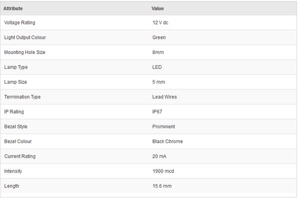 RS PRO 132-9134 Green Indicator, 12 V dc, 8mm Mounting Hole Size, Lead Wires Termination, IP67 - New - Brand new item, still in OEM packaging  - Check out the images for more product details Product details:- 8 mm Rear...View more