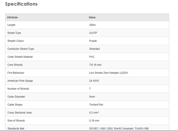 RS Pro UTP5EST24AWG100LS Purple Cat5e Ethernet Cable U/UTP, PVC LSZH 305m(1 Reel of 305 Metre) - Brand new item, still in OEM packaging  - Check out the images for more product details Product details Enhanced, high-performanceCat5e cable for LAN applications...View more