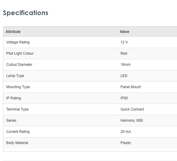 Schneider Electric XB6ECV4JP Harmony XB6 Red LED Pilot Light, 16mm Cutout, IP65, 12 V, 20 mA - Brand new item, still in OEM packaging  - Check out the images for more product details Product details Pilot Lights, Square Head, Integral...View more