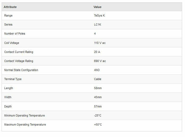 Schneider Electric LC1K09004FC7 Pole Contactor 4NO 20A 110Vac Coil - New - Brand new item, still in OEM packaging  - Check out the images for more product details Product details: Attribute                   Value Range   :  TeSys K Series   : ...View more