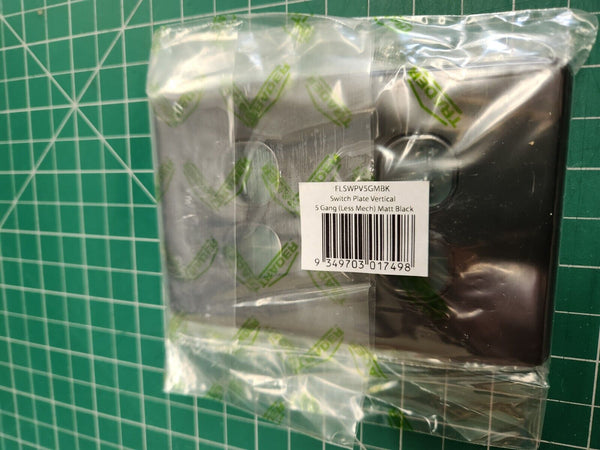 SWITCH PLATE VERTICAL 5 GANG SLIM LESS MECH MATT BLACK - TRADER- FLSWPV5GMBK PRODUCT DETAILS: SWITCH PLATE VERTICAL 5 GANG SLIM LESS MECH MATT BLACK Flat Cat Range of Switches & Switch Plates• Switches are rated 10AX/16A 250V~ and approved...View more