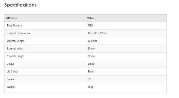 Takachi Electric Industrial SS ABS Enclosure, 125 x 80 x 32mm-New - Brand new item, still in OEM packaging  - Check out the images for more product details Product details: Flame Resistant Plastic Case SS series Close fitting top and...View more