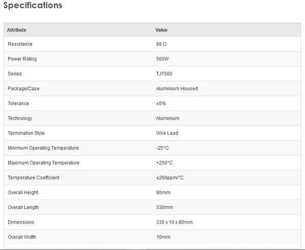 TE Connectivity Lead Aluminium Panel Mount Resistor 68? ±5% 500 - TJT50068RJ
