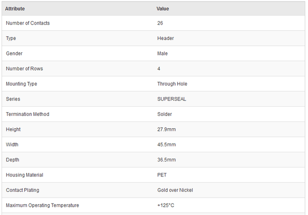 TE Connectivity 9-6437287-8  Superseal Series, 4 Row 26 Way Through Hole Plug Header, with Solder Termination Method. Product details:- TE Connectivity SUPERSEAL Series 1.0 Pin Headers SUPERSEAL vertical mounting 1.0mm pin headers with IP 67 sealing, polyester housings and gold...View more