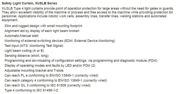 Telemecanique XUSLB Light Curtain Sender & Receiver 34 Beams 30mm Res - New in Box -Brand New, unused, still in OEM packaging -Check out the images for more product details Product details: See specifications in Images above Manufacturer: Telemecanique Manufacturer...View more