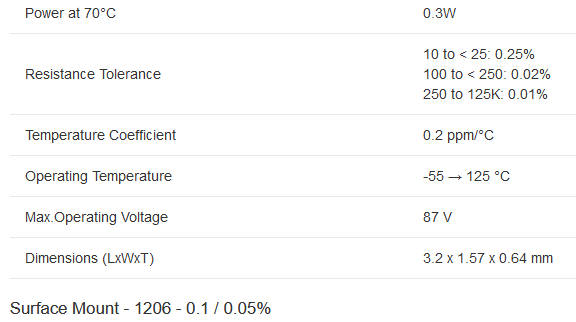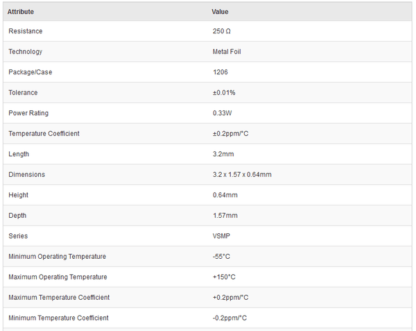 Vishay Foil Resistors Y1625250R000T9R 250Ω 1206 Metal Foil Precision Surface Mount Fixed Resistor ±0.01% 0.33W - New - Brand new item, still in OEM packaging  - Check out the images for more product details Product details:- 1206 Format VSMP Series...View more