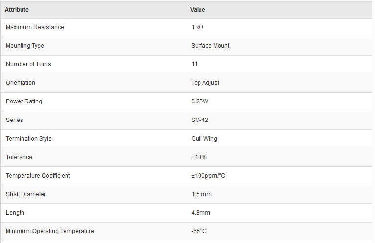 Copal Electronics SM-42X 1k Ohm 1kΩ SMD Trimmer Potentiometer 0.25W Top Adjust - New - Brand new item, still in OEM packaging  - Check out the images for more product details Product details:-Cermet Trimmer SM-42 Series (11-Turn model) 4.8mm Multi-turn...View more