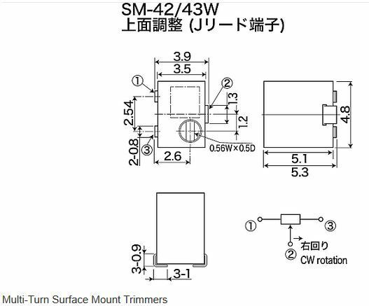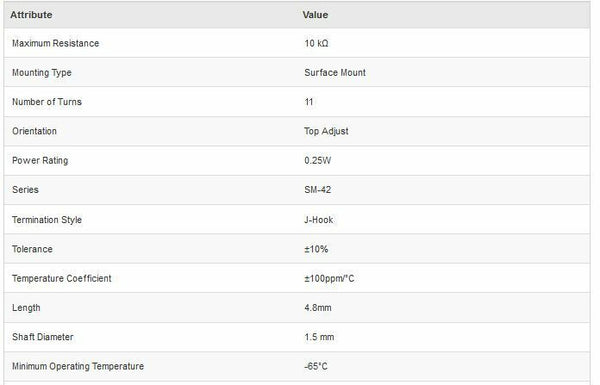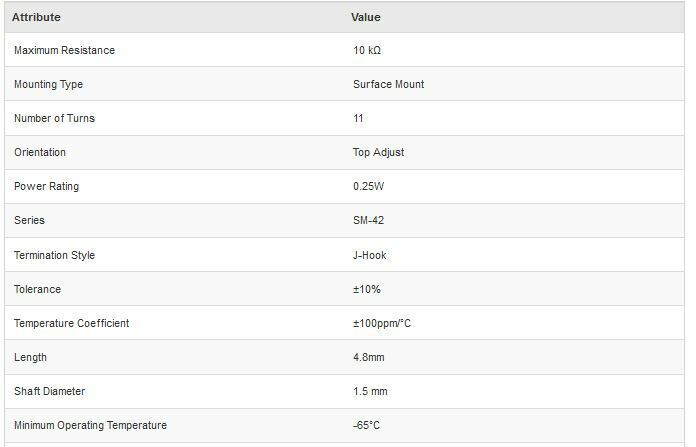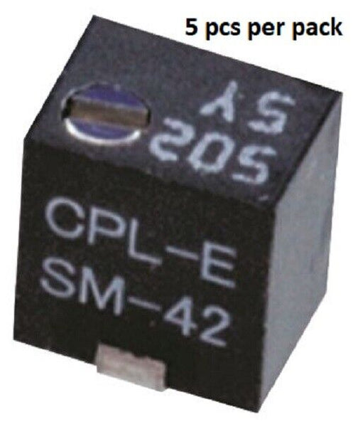 Copal Electronics 10k Ohm Trimmer Potentiometer 0.25W - SM-42W - New Brand: Copal ElectronicsModel: SM-42WCondition: Brand new, still in OEM packagingQuantity: Pack of 5 Pcs Product Details: Type: Cermet Trimmer, SM-42 Series Adjustment Type: 11-Turn model, Top adjusting, J-hook leads...View more